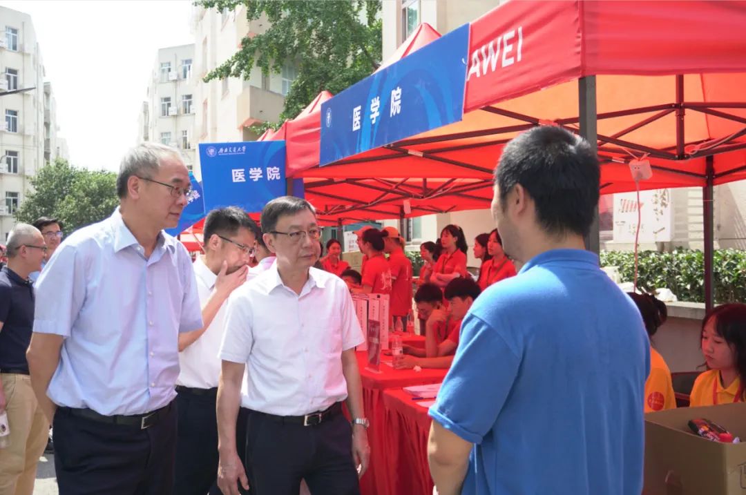 7时48分,第一位2023级新生带着灿烂的笑容到达迎新点,顺利完成报到手续。随后,越来越多的2023级医学学子陆续入校报到。志愿者们清点入学材料、办理入学手续、领取入学资料、分发新生礼物,解答各种疑惑,一边带学弟学妹前往宿舍,一边向学弟学妹介绍交医学的学习和生活。迎新现场也有不少新生家长的身影,辅导员老师们与家长亲切交谈,向家长们介绍学校、学院的情况,消除家长们的顾虑,让家长们放心将学生送到学校。