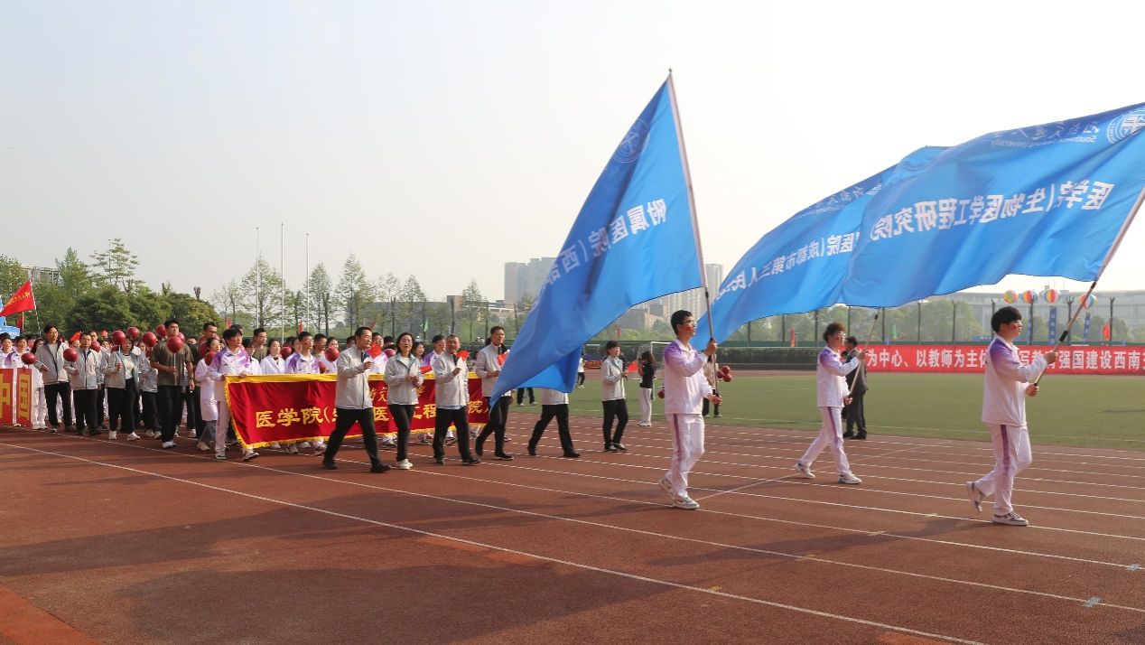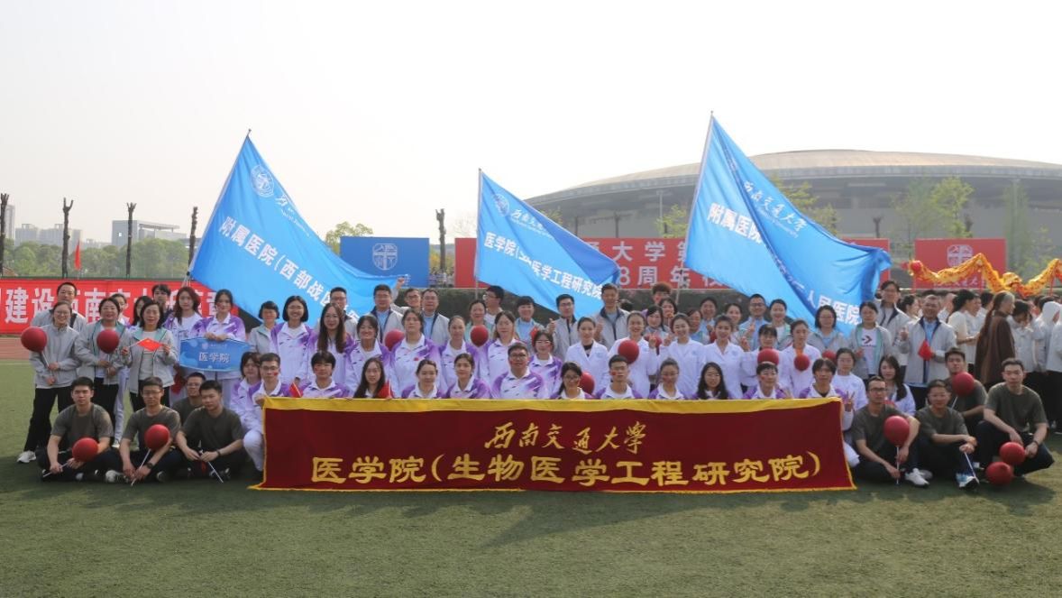 4月12日上午,西南交通大学第123届运动会暨建校128周年校庆运动会开幕式于犀浦校区北区体育场隆重开幕。yl23455永利官网和附属医院成都市第三人民医院、西部战区总医院师生组成方阵参加了此次运动会。