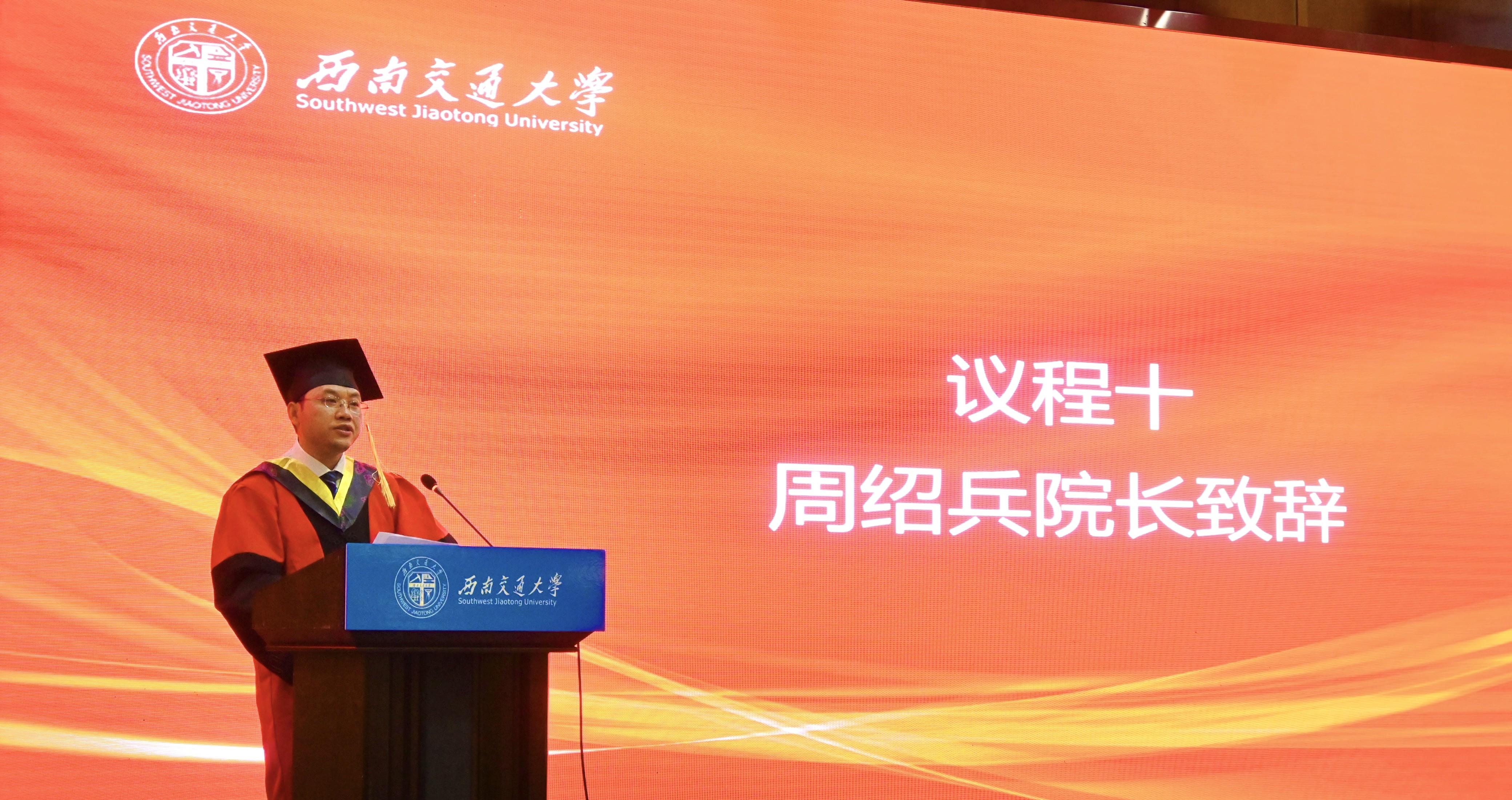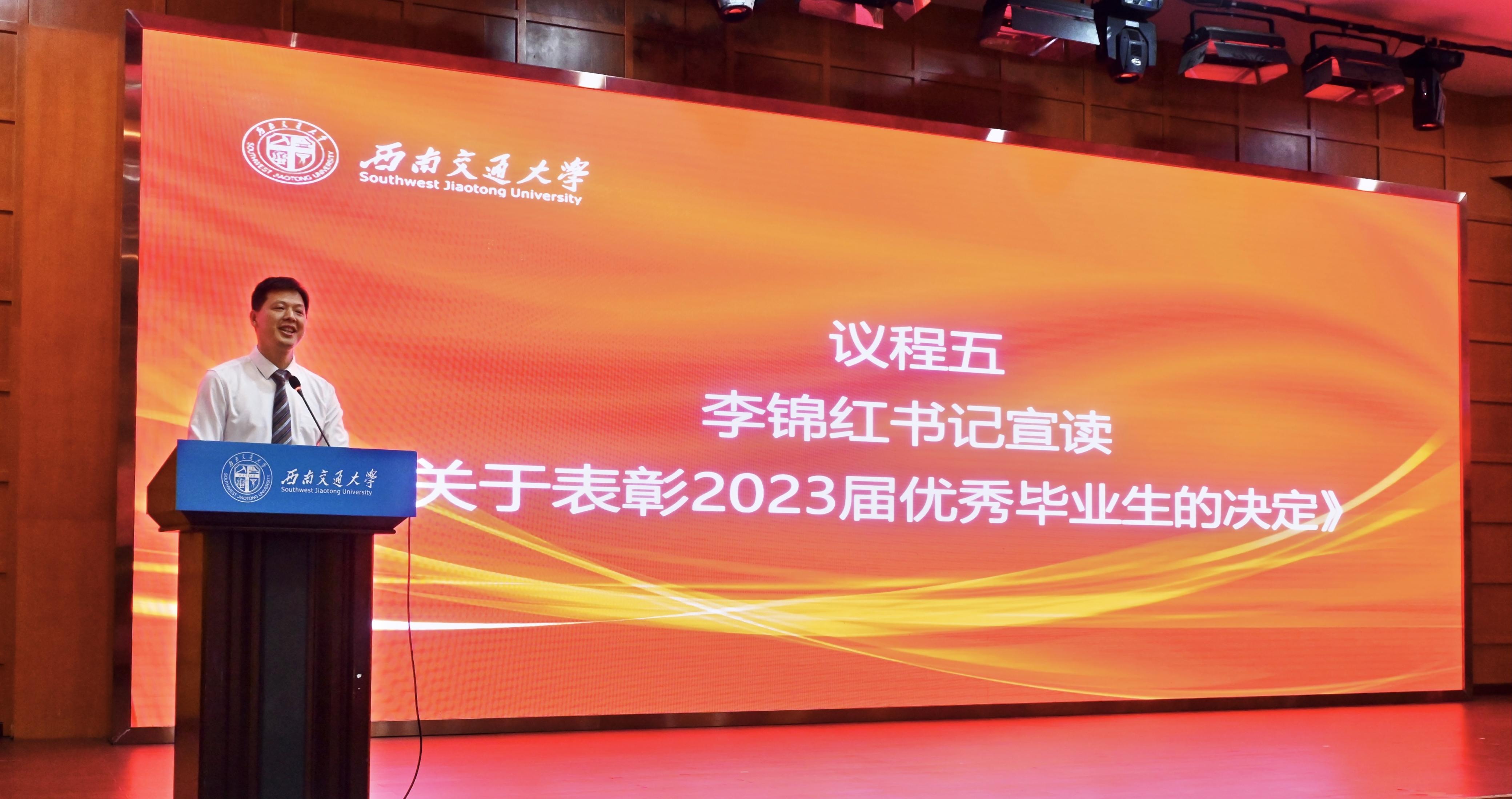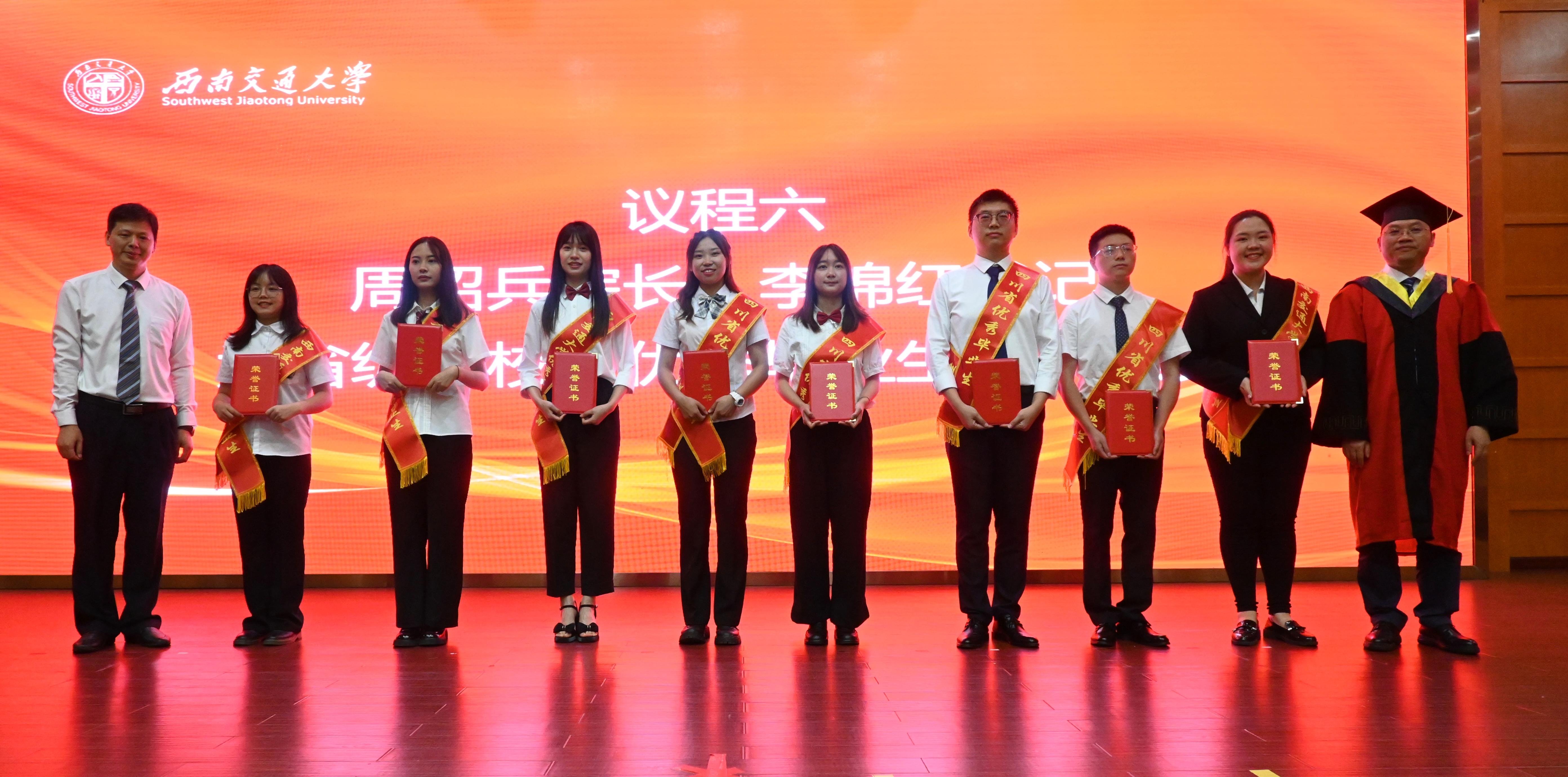 学院党委书记李锦红宣读了《关于表彰2023届省级、校级优秀毕业生的决定》。经校长办公会审定,四川省教育厅批准,决定授予yl23455永利官网李杨、周孟雪2名本科生,梁琦、武楷文、赵治戎3名研究生,“四川省优秀大学毕业生”荣誉称号。经校长办公会审定,决定授予yl23455永利官网侯丁煜、梁月、于昕冉、赵一心、姚烨兰5名本科生,罗强、刘瑶、鲁欣、杨雪、喻谦、张婕鑫、张雪7名研究生“西南交通大学优秀毕业生”荣誉称号。李锦红书记向获表彰的毕业生及全体毕业生致以祝贺,希望广大毕业生坚定理想信念,继续秉承和发扬“竢实扬华,自强不息”的交大精神,脚踏实地、埋头苦干,肩负当代大学生的使命担当,续写新时代青年的奋斗征程。随后,周绍兵院长与李锦红书记共同为获得省级、校级优秀毕业生的同学们颁发了证书。