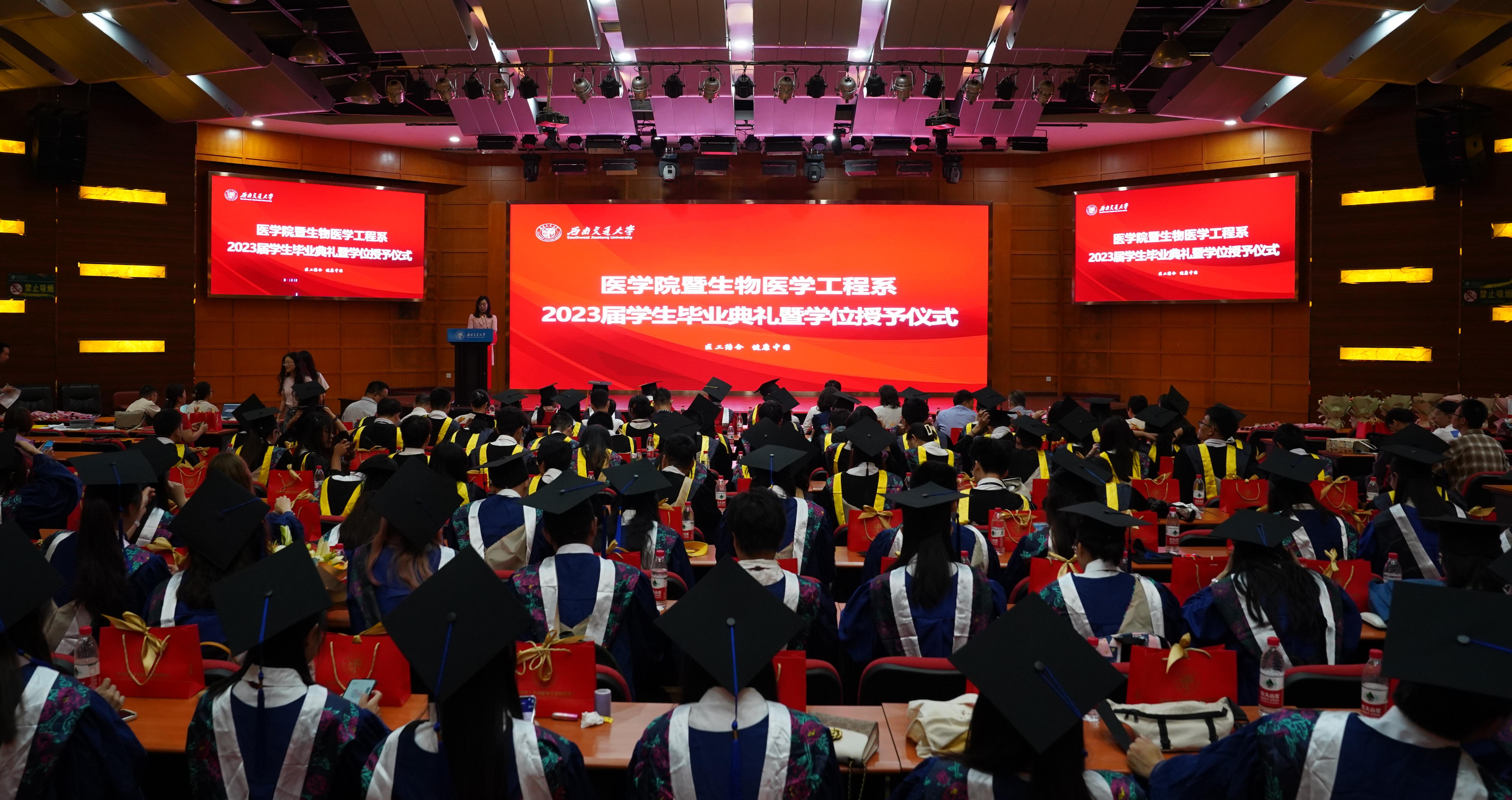 6月17日上午10时,yl23455永利官网暨生物医学工程系2023届学生毕业典礼暨学位授予仪式在九里校区国际会议厅隆重举行。yl23455永利官网院长周绍兵、党委书记李锦红、附属医院成都市第三人民医院党委书记徐俊波、yl23455永利官网副院长冷永祥、副院长李暄,生物医学工程系、附属医院第三人民医院和西部战区总医院的近30名导师、yl23455永利官网机关各办公室老师以及毕业生亲友出席典礼。yl23455永利官网党委副书记于楠主持典礼。