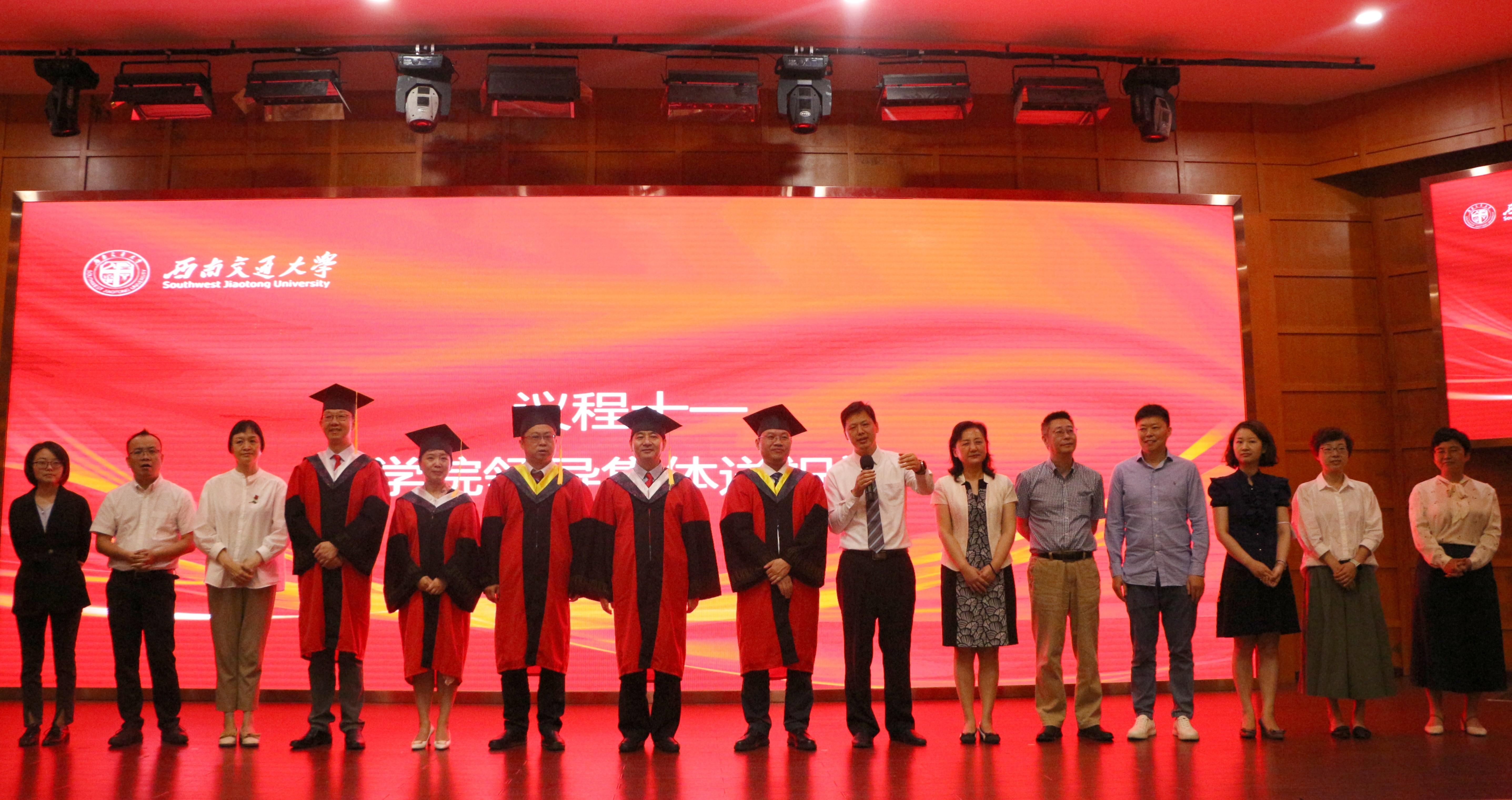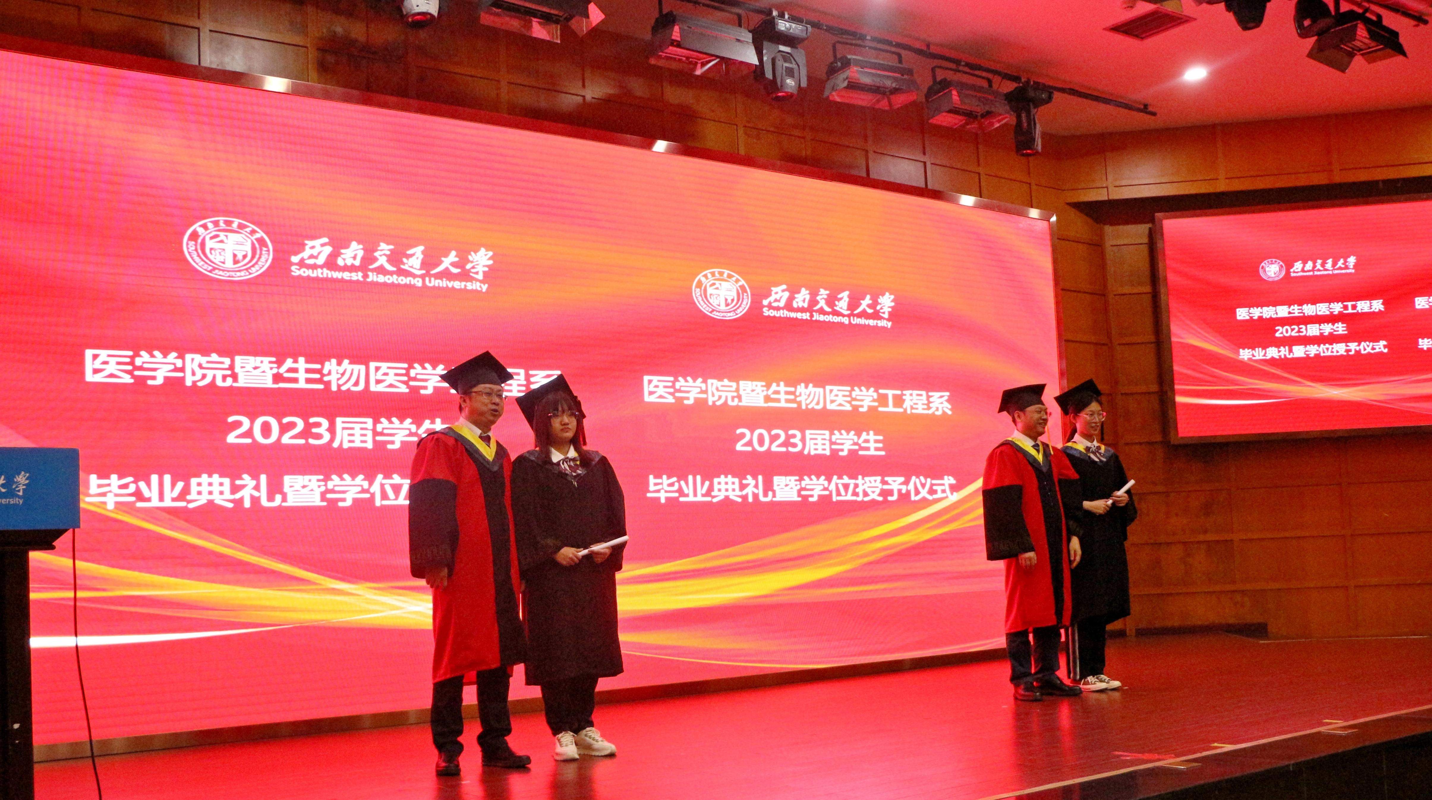 在雄壮的国歌声中,典礼拉开帷幕。典礼上,yl23455永利官网副院长冷永祥宣读了《yl23455永利官网2023年6月学士、硕士学位授予决定》。经西南交通大学学位评定委员会第21次会议审议通过,决定授予yl23455永利官网2023届学生学士学位54人、硕士学位52人。随后,yl23455永利官网院长周绍兵、副院长冷永祥为yl23455永利官网获工学学位的2023届毕业生授位,成都市第三人民医院导师徐俊波、西部战区总医院导师戴睿武为yl23455永利官网获医学学位的2023届毕业生授位,并合影留念。当流苏被拨动,广大毕业生开启了新的人生征程。