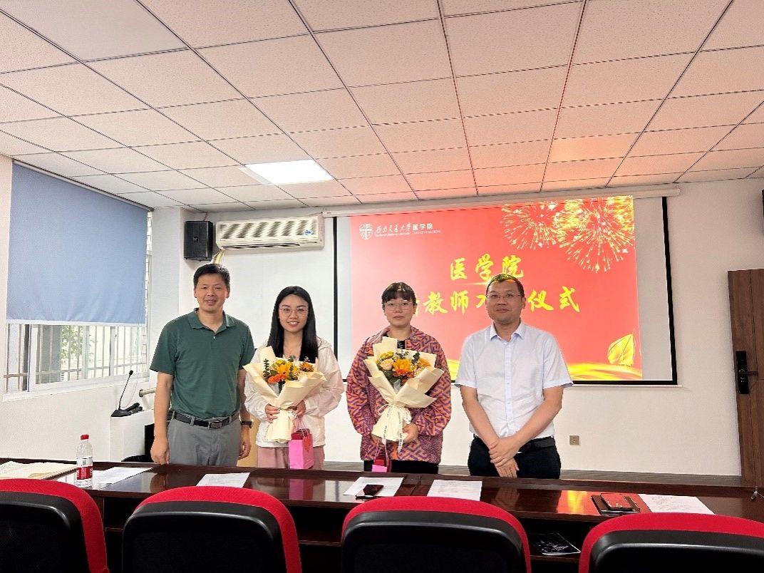 周绍兵院长和李锦红书记为两位青年教师送上鲜花和纪念品。