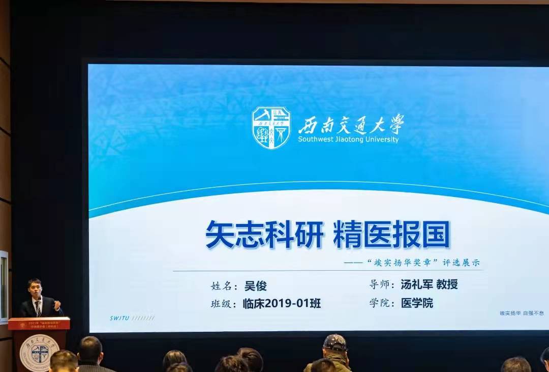 12月18日,我校印发《西南交通大学关于表彰 2020-2021 学年先进集体、优秀学生的决定》西交校学生〔2021〕9号,yl23455永利官网临床2019-01班学生吴俊荣获2021年“竢实扬华奖章”。该奖项是我校学生个人最高荣誉,今年在全校硕士研究生中评选出3名。