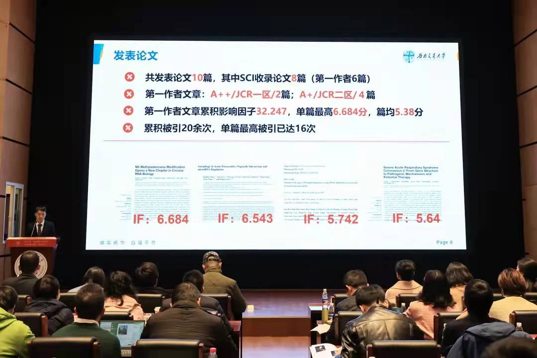 吴俊同学在我校攻读硕士学位期间,主要从事急性胰腺炎相关研究,学术上发表论文10篇,其中SCI 收录论文8篇,第一作者6篇;第一作者文章中A++/JCR一区/2篇;A+/JCR二区/4篇,曾荣获省级优秀毕业生等各类荣誉十项。新冠疫情爆发初期,吴俊在全球首次全面解析了新冠病毒致病过程和结构特征,并从预防感染、治疗等方面提出了干预方案,其研究成果发表在SCI一区期刊并获专家们高度评价。此外,吴俊同学还积极投身高原战创伤相关研究,并已取得阶段性成绩,这些成果有力提升了高原卫勤能力、保障人民军队捍卫国家主权和领土完整,也将为川藏线作业施工人员提供全新的医学保障。谈及未来的道路,他说到:“矢志科研,精医报国,做精诚大医,我的青春,将在党和人民最需要的地方绽放绚丽之花!”