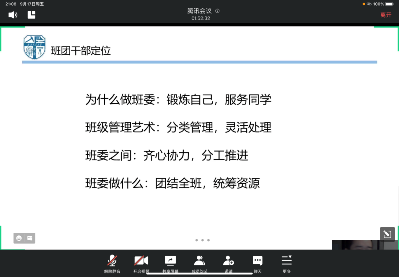 为增强我院学生干部的全局意识、服务意识、责任意识、效率意识,提高学生干部队伍整体素质。2021年9月17日晚,yl23455永利官网2021级新生入学教育之班团干部培训通过线上讲座方式开展,讲座由yl23455永利官网学工组副组长胡豪老师主讲,yl23455永利官网辅导员黄雪梅、组织员蔡俊俊、2021级新生班委和高年级新任班委共20余名班团干部参加讲座。