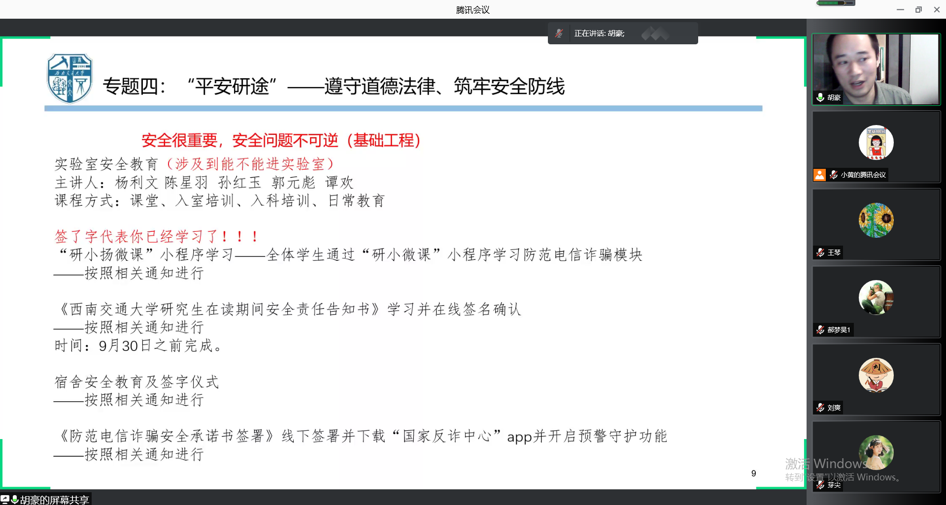 接着,胡豪说明了学院入学教育的开展形式,主要在“覆盖全员、分类指导、把握重点、突出特色”为原则的基础上,结合学院学生来源复杂、年龄覆盖广、实验任务重、科研实验空间跨度广的特点,以线上与线下相结合、讲座与交流相搭配、课程与培训相贯通的形式开展入学教育。
