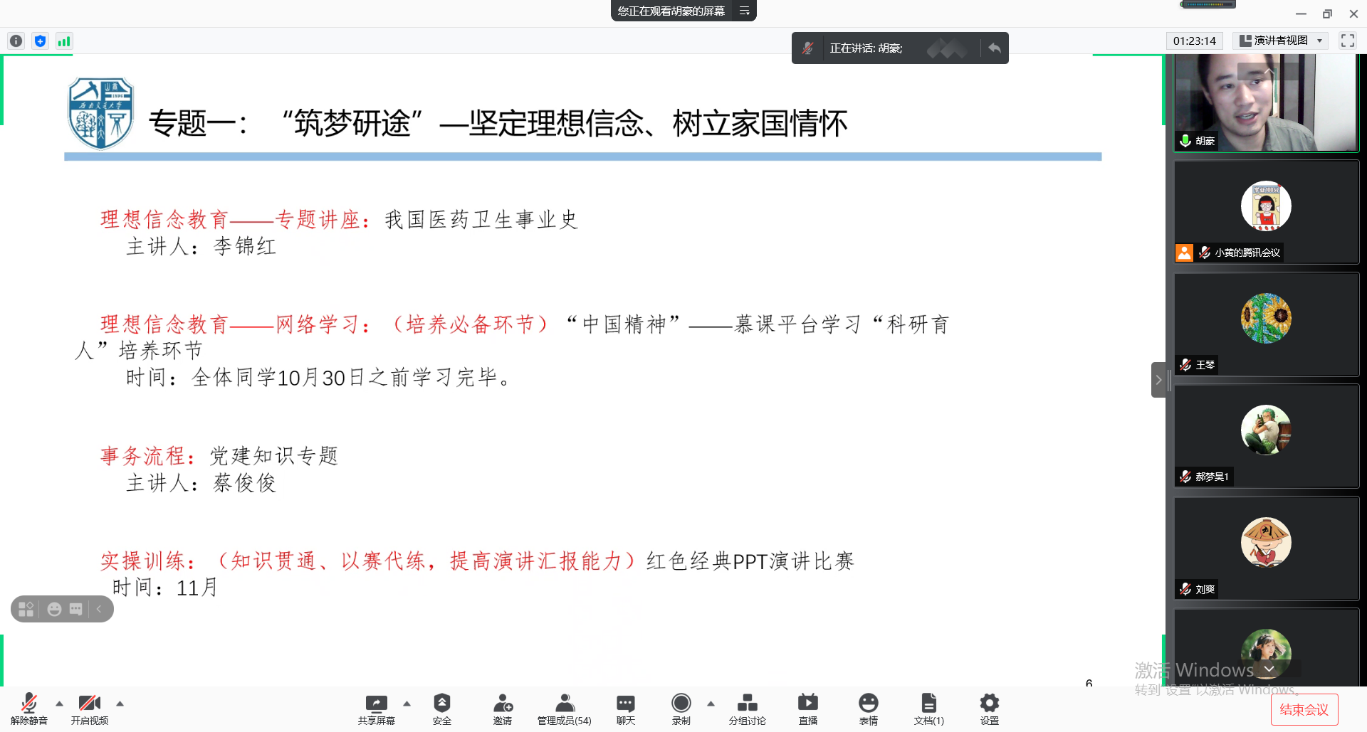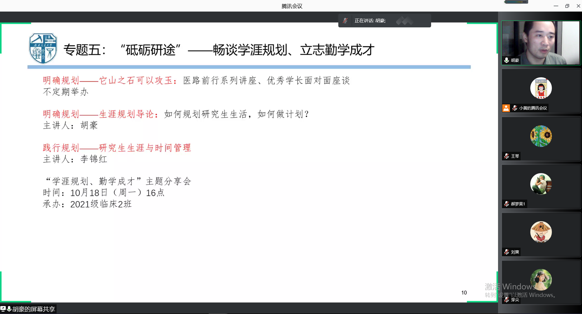 为深入学习贯彻习近平总书记“七一”重要讲话精神,深入贯彻落实习近平总书记对教育工作的重要论述精神尤其是对研究生教育工作作出的重要指示精神,以帮助研究生新生熟悉学习环境、遵守行为规范、恪守学术道德、坚定理想信念、笃定人生目标、矢志奋斗报国为指向,号召学生铭党恩、听党话、跟党走,引导学生立大志、明大德、成大才、担大任,助力提升培养质量,学院拟结合“四史”学习,围绕学校“双一流”建设和思想政治工作,聚焦有西南交通大学特色的医学生培养,开展“医路梦”新生入学系列讲座。9月17日晚,学院通过腾讯会议举行研究生新生入学教育讲座开班仪式。讲座由yl23455永利官网学工组副组长胡豪主讲,yl23455永利官网辅导员黄雪梅、组织员蔡俊俊、2021级全体研究生新生参与开班仪式。