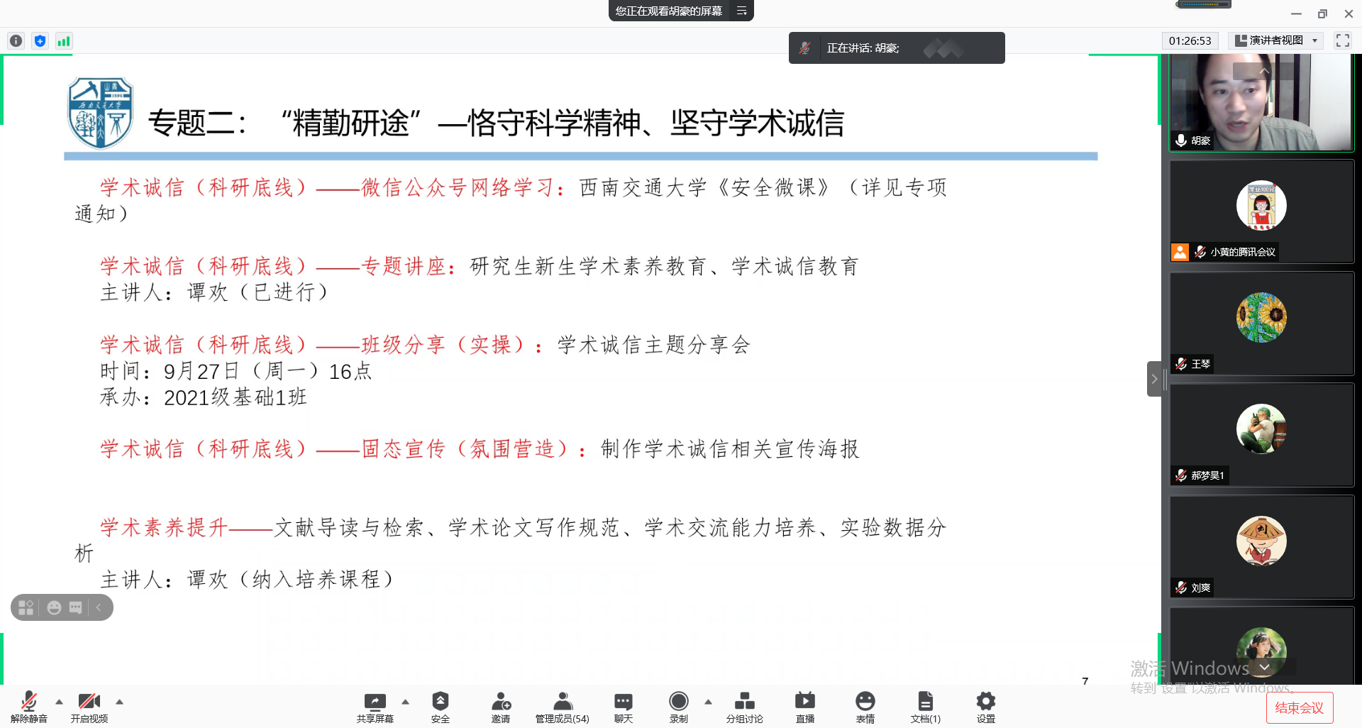 最后,胡豪就学院研究生新生入学教育系列讲座的内容进行了详细的安排。