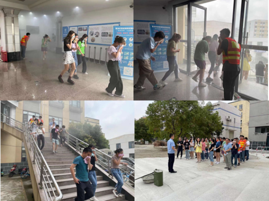活动第二阶段,参训人员参与紧急疏散演练。烟饼点燃后,全员用湿毛巾捂住口鼻,根据统一指令,按照路线和指示疏散到指定空地集合,在实践中学习发生火灾时如何进行疏散自救。