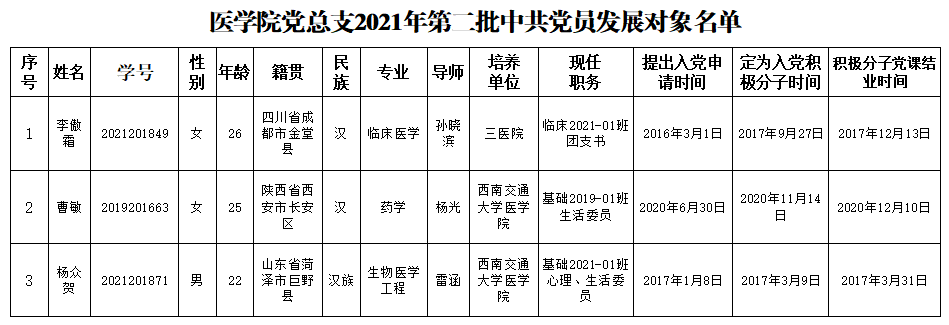 经群众意见征集、党支部委员会讨论、yl23455永利官网党总支委员会会议审批,现将yl23455永利官网党总支2021年第二批发展对象名单公示如下: