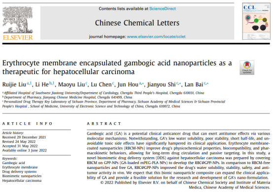 近日,yl23455永利官网研究生导师侯君团队在中国化学会主办、中国医学科学院药物研究所承办的中科院Q1区SCI刊物Chinese Chemical Letters(IF:8.455)发表题为“Erythrocyte membrane encapsulated gambogic acid nanoparticles as a therapeutic for hepatocellular carcinoma”的研究。