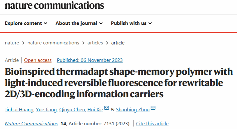 近日,yl23455永利官网(生物医学工程研究院)周绍兵教授团队谢辉副教授在智能动态软材料研究中取得最新进展。谢辉副教授是我校软物质创新团队的骨干成员。相关研究成果以“Bioinspired thermadapt shape-memory polymer with light-induced reversible fluorescence for rewritable 2D/3D-encoding information carriers”为题,发表在国际综合性期刊《Nature Communications》上,论文的第一作者为yl23455永利官网(生物医学工程研究院)博士研究生黄金辉,通讯作者为周绍兵教授和谢辉副教授。