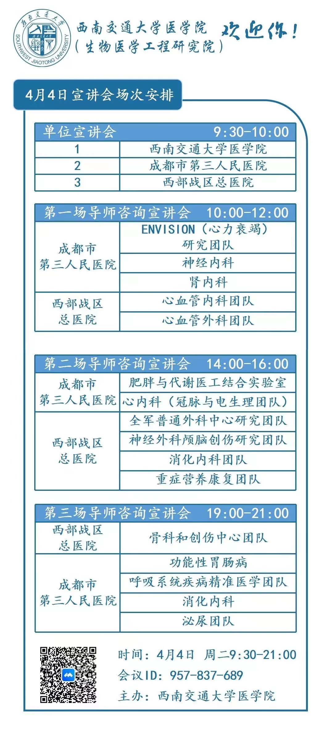 根据学院招生需求,可接受部分临床医学(学术型)考生调剂。为帮助广大考生更深入了解我院研究生导师团队相关信息,学院将于4月4日邀请部分导师团队召开线上咨询会。欢迎有意愿调剂到我院的考生,通过腾讯会议平台与学院导师团队进行线上互动交流。
