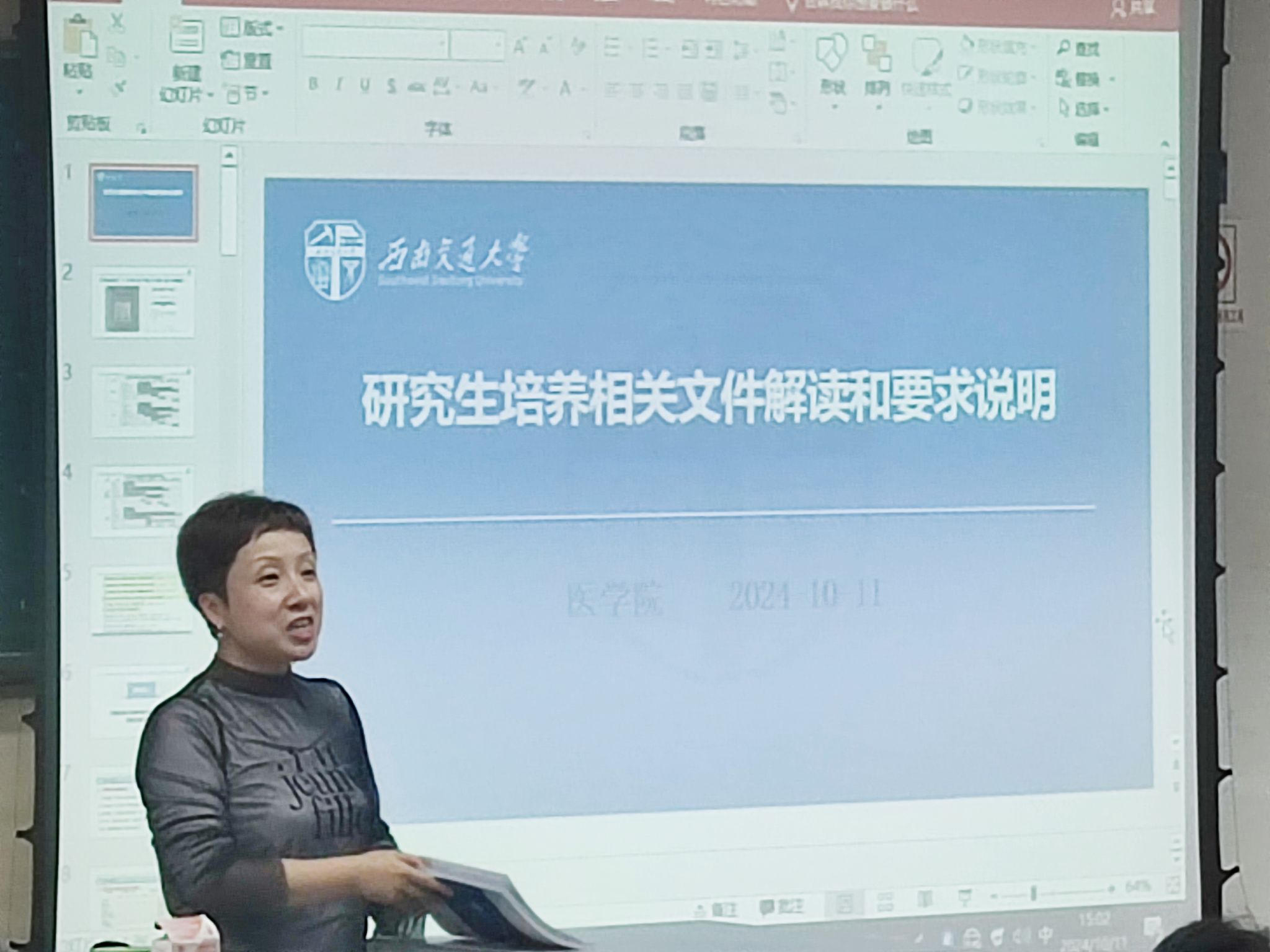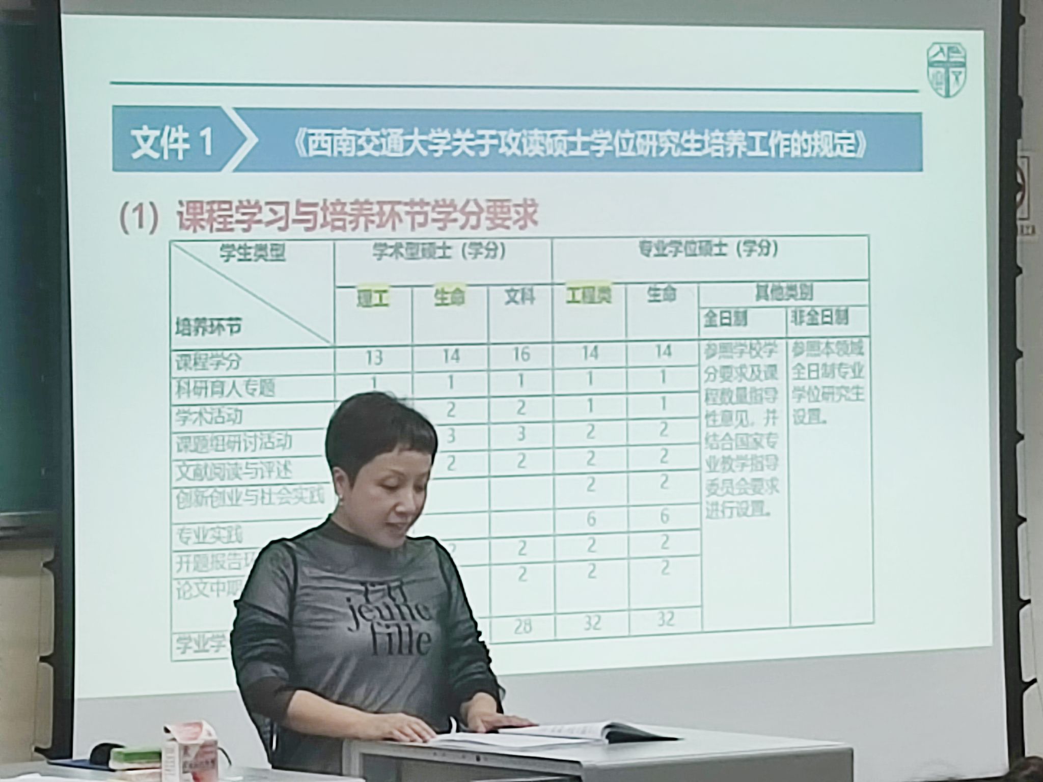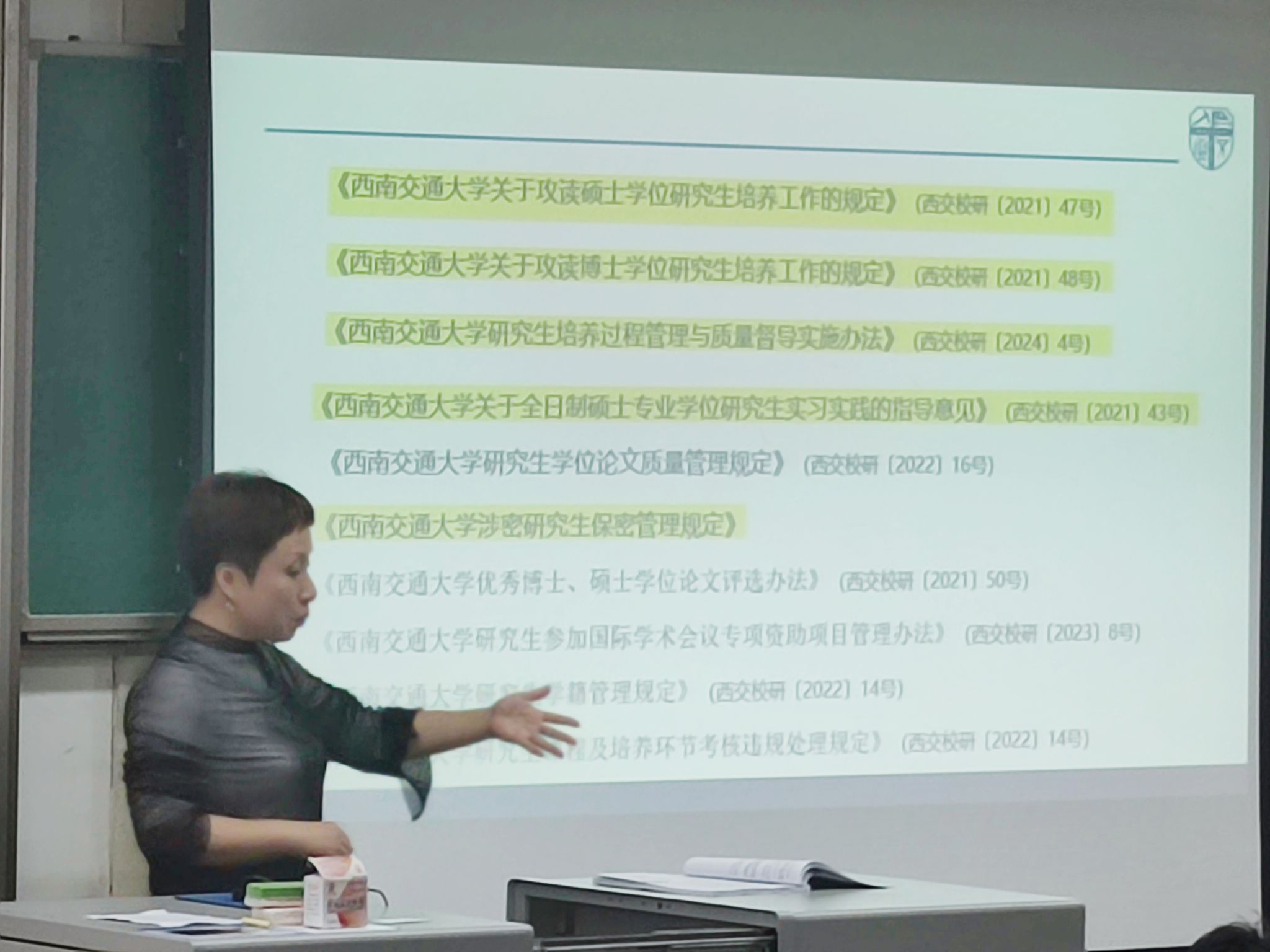 接着,刘老师深入解析了几份关键性文件,包括但不限于《西南交通大学关于攻读硕士学位研究生培养工作的规定》、《西南交通大学关于攻读博士学位研究生培养工作的规定》以及《西南交通大学研究生培养过程管理与质量督导实施办法》等。通过对这些规定的细致解读,不仅让同学们明确了课程学习的具体要求如时间安排、学分获取标准等内容,同时也加深了大家对整个研究生期间自我管理和规划的认识。