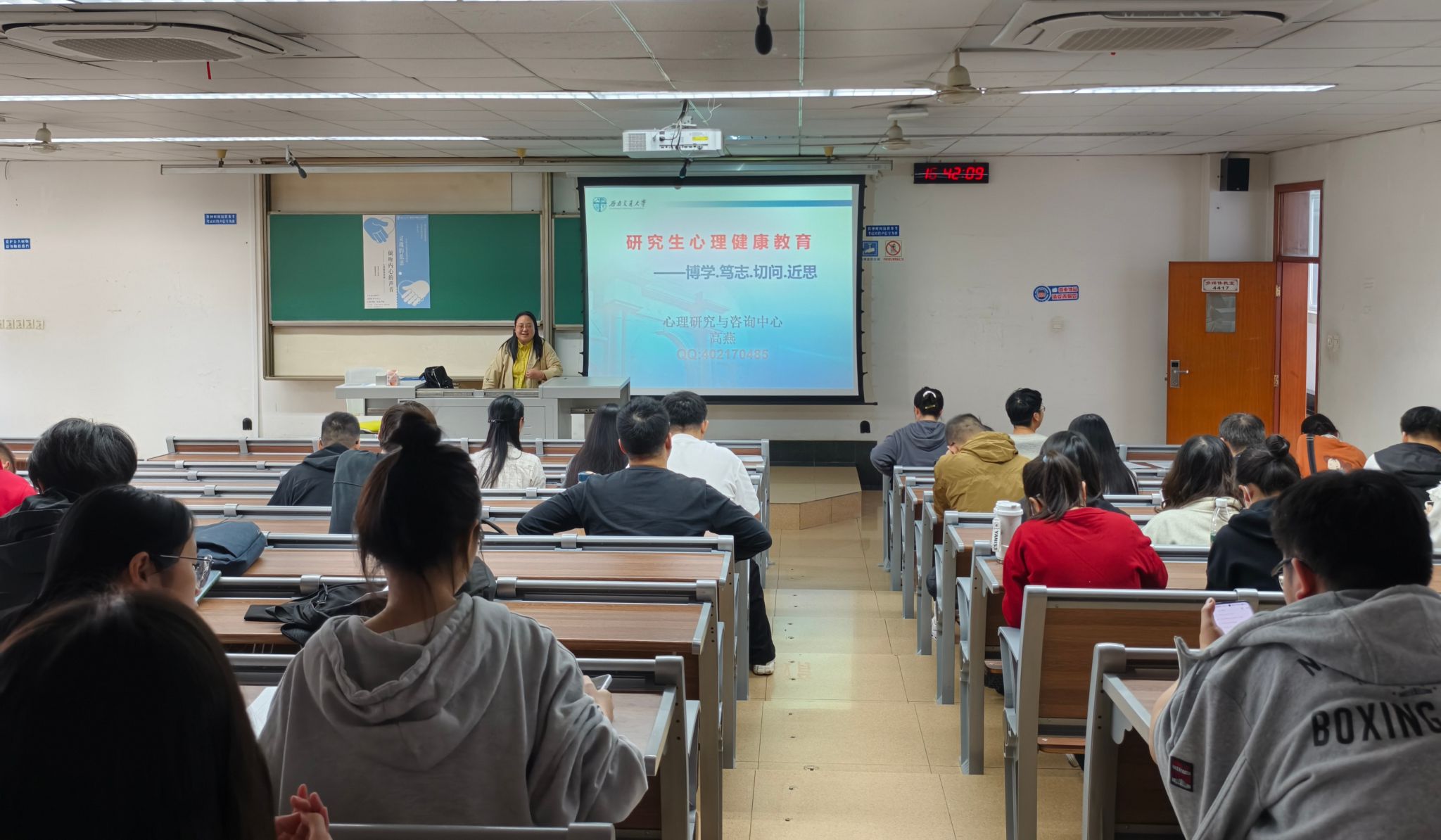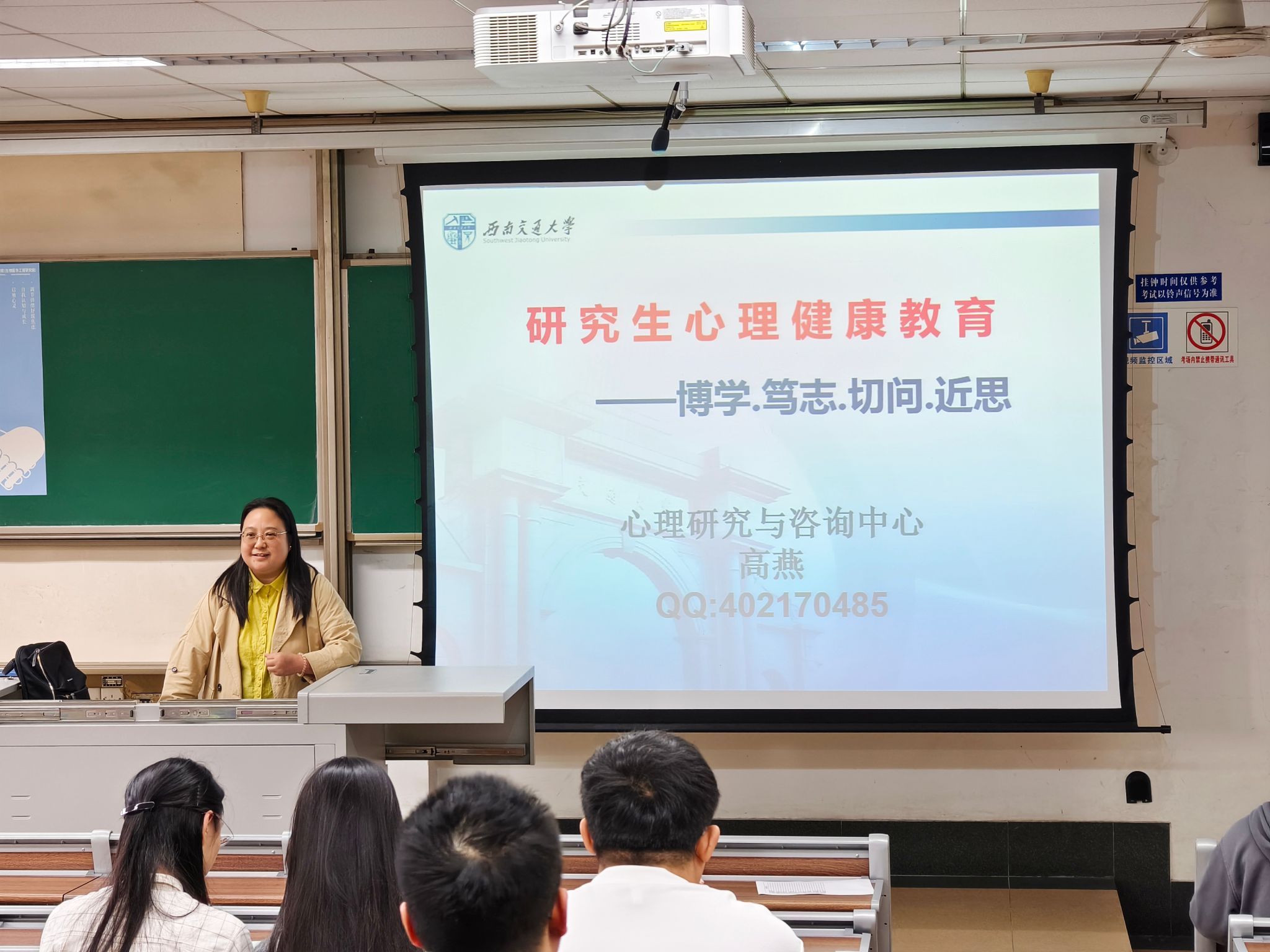 心理健康是学术成功的基石。一个健康的心态能够帮助学生更好地应对压力,激发创造力,提升学习效率。2024年11月1日下午16时30分许,yl23455永利官网邀请到西南交通大学心理研究与咨询中心的高燕老师为2024级全体研究生开展了一场以“倾听内心的声音”为主题的心理健康讲座,帮助同学们在繁忙的学业中,保持积极健康的良好心态。