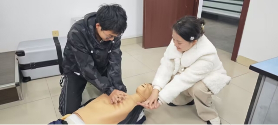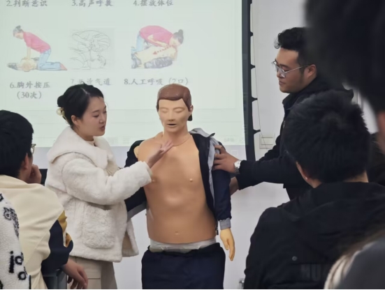 随后,廖百雪在现场进行心肺复苏和AED使用的示范操作。她将此前讲解的理论知识生动地转化为实际操作,针对实际急救操作中的关键要领进行了详尽阐释,使同学们更直观地了解到正确操作的要点。不仅如此,廖百雪还补充讲解了海姆利克急救法的适用情形及具体操作步骤,并热情邀请现场同学上台进行模拟操作,让同学们在亲身体验中更好地掌握这一急救技能。