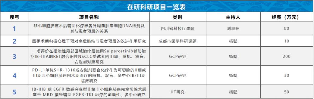 在科主任的带领下,经过科室员工的共同努力,普胸外科在成科后,获得多项市级、省级科研立项项目,其中含100万元省级课题一项,在国内外核心期刊上发表论文40余篇,其中SCI收录文章超10篇。同时,加入国际顶级肺癌研究学组CTONG,开展各类多中心临床研究达近十项。