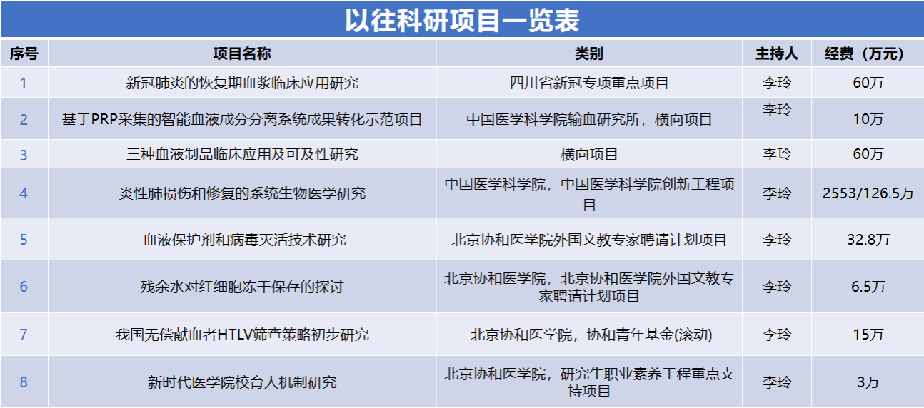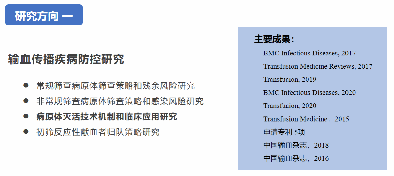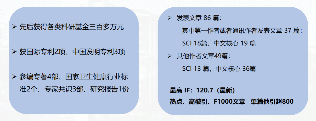 获批四川省重点项目等各级项目十余项;发表文章80余篇,其中在 JAMA、Transfusion 等发表SCI论文30多篇,发明专利5项;参与编写专著 4 本,参与编写专家共识 3 个,参与编制国家卫生行业标准2个。