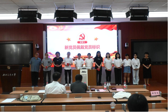 大会第二阶段,进行了新党员入党宣誓大会。党委书记李锦红宣读了《中共yl23455永利官网委员会关于同意接收预备党员的批复》。孙鸿、屈树新两位在党三十年的老党员同志一一为新党员们佩戴了党徽并颁发党章。李锦红书记为大家解读了入党誓词的深刻内涵,并带领全体党员面对党旗进行了庄严宣誓。