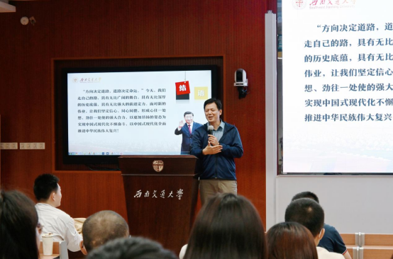 马先睿老师从“深刻认识中国式现代化的内涵要求”“牢牢把握高质量发展这一关键钥匙”“踔厉奋发走好中国式现代化道路”三个方面,以生动幽默的语言和丰富的案例对“中国式现代化”进行了深刻阐释。他强调,面对新的伟业,我们应坚定信心、同心同德、形成合力,以更加昂扬的姿态为实现中国式现代化不懈奋斗,以中国式现代化全面推进中华民族伟大复兴。