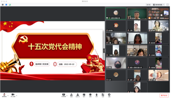 2022年9月22日晚8时,临床第二党支部通过腾讯会议于线上召开了本周的党支部集中学习会。本次学习会由支部书记张雪同志领学,全体党员参加,会议分为两个议程,第一个议程为学习西南交通大学第十五次党代会精神,第二个议程是支部工作法的学习与讨论。