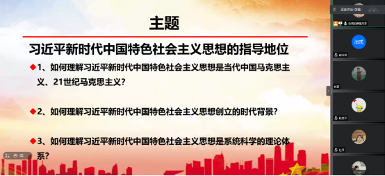 最后,张雪同学总结道,习近平新时代中国特色社会主义思想是对马克思列宁主义、毛泽东思想、邓小平理论、“三个代表”重要思想、科学发展观的继承和发展,是马克思主义中国化最新成果,是党和人民实践经验和集体智慧的结晶,是中国特色社会主义理论体系的重要组成部分,是全党全国人民为实现中华民族伟大复兴而奋斗的行动指南,必须长期坚持并不断发展。希望大家以实际行动把增强“四个意识”、坚定“四个自信”、做到“两个维护”要求落到实处,深入学习贯彻习近平新时代中国特色社会主义思想,增强守初心、担使命的自觉性,以实际行动攻克科研难题,不断学习新知识,努力充实自己,成为对社会有用的人才。