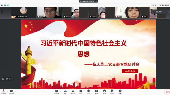 2021年8月26日晚20:00,yl23455永利官网临床第二党支部全体成员举行了线上专题研讨会,会议围绕“深入学习领会习近平新时代中国特色社会主义思想”进行交流讨论,会议由党支部书记张雪主持,支部各位党员结合自身实际,发表了对习近平新时代中国特色社会主义思想的理解与认识。