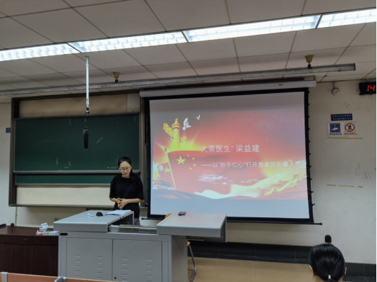 第一个故事是由临床第一党支部的张悦同志为大家分享的《“大美医生”梁益建——以“妙手仁心”打开患者的折叠人生》。“自诩小医生,四处奔走募集善良,打开那些被折叠的人”,这是2016年感动中国人物“梁益建”的颁奖词。脊柱畸形改变的不仅是人的外形,与之相生相伴的呼吸衰竭、心脏衰竭,不断侵蚀着人的生命。虽然自我定位为“小医生”,但梁益建做出的却是大成就:他所接受的脊柱畸形患者,很大一部分是屡次被国内医院所拒绝的。他在无数个本可以拒绝的病例中创造出了一连串的“之最”,突破了国际上公认的极重度脊柱畸形的手术三大禁区。梁益建医生拯救了无数人的生命,重启了他们的人生。