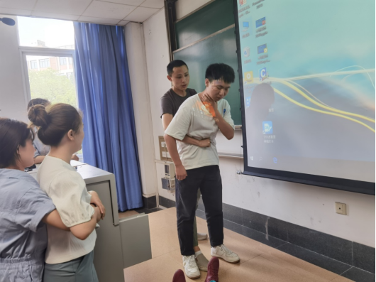 最后,由马克思主义学院的同学们进行实操练习,并由服务队同志在旁指导规范动作。在此过程中,同学们还针对急救问题向服务队队员提问,热情高涨。