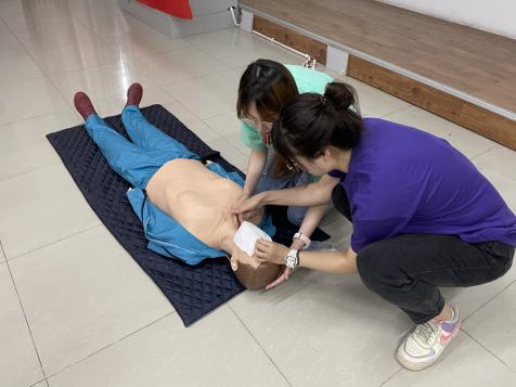 学习完理论上的知识,紧接着由罗艳同学结合“模拟人”为大家演示了从发现倒地的病人、开展心肺复苏术到结束救援的整个过程。运用图片与现场演示相结合的方法,逐一为大家讲解操作要点与注意事项。