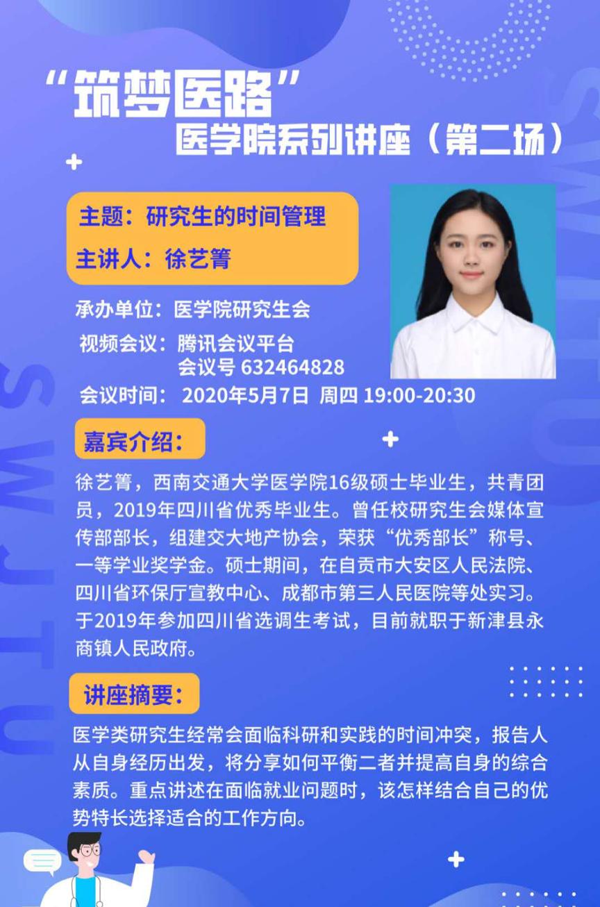 嘉宾介绍:徐艺箐,yl23455永利官网16级硕士毕业生,共青团员,2019年四川省优秀毕业生。曾任校研究生会媒体宣传部部长,组建交大地产协会,荣获“优秀部长”称号、一等学业奖学金。硕士期间,在自贡市大安区人民法院、四川省环保厅宣教中心、成都市第三人民医院等处实习。于2019年参加四川省选调生考试,目前就职于新津县永商镇人民政府。