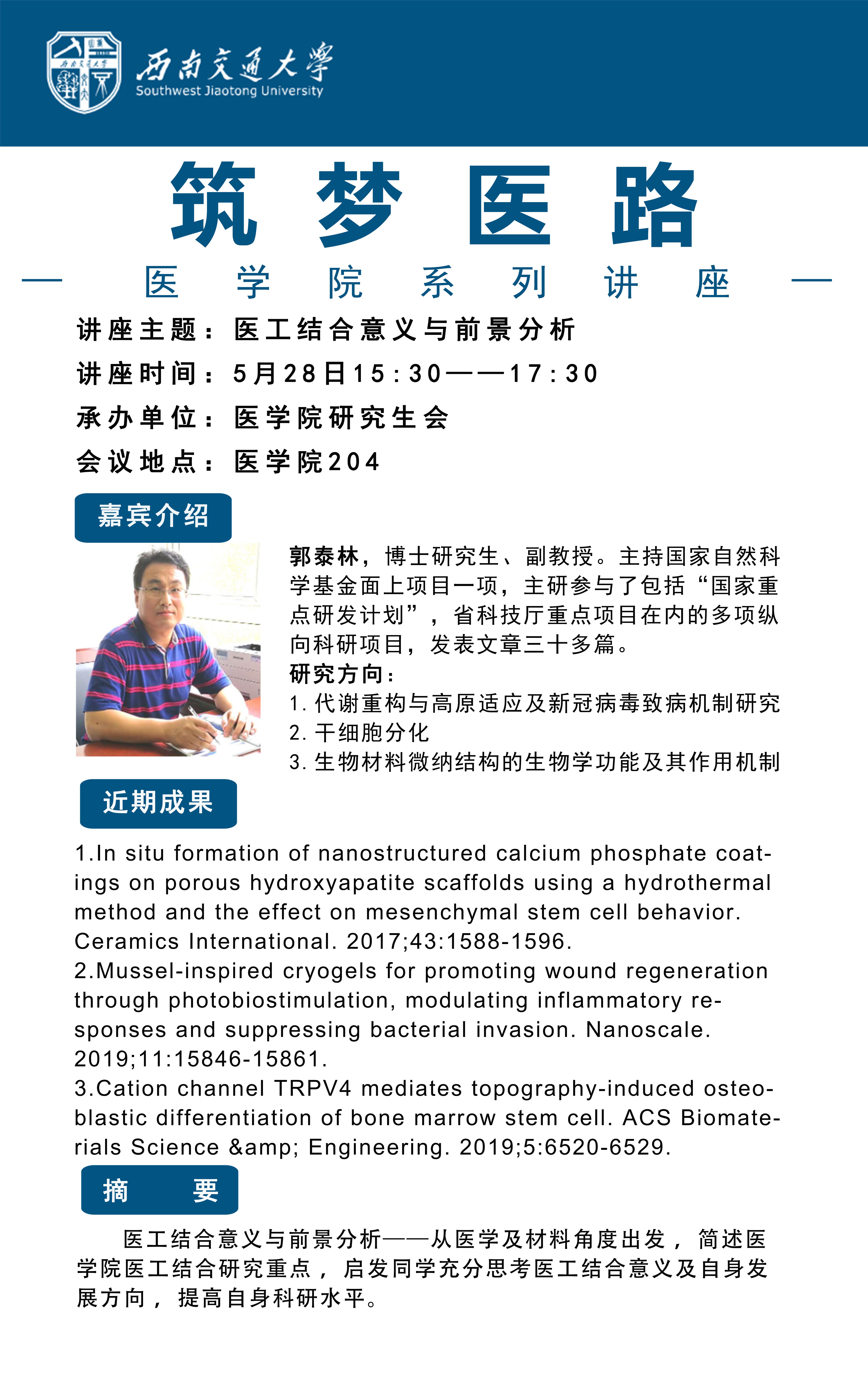 讲座摘要:医工结合意义与前景分析——从医学及材料角度出发 ,简述yl23455永利官网医工结合研究重点 ,启发同学充分思考医工结合意义及自身发展方向,提高自身科研水平。