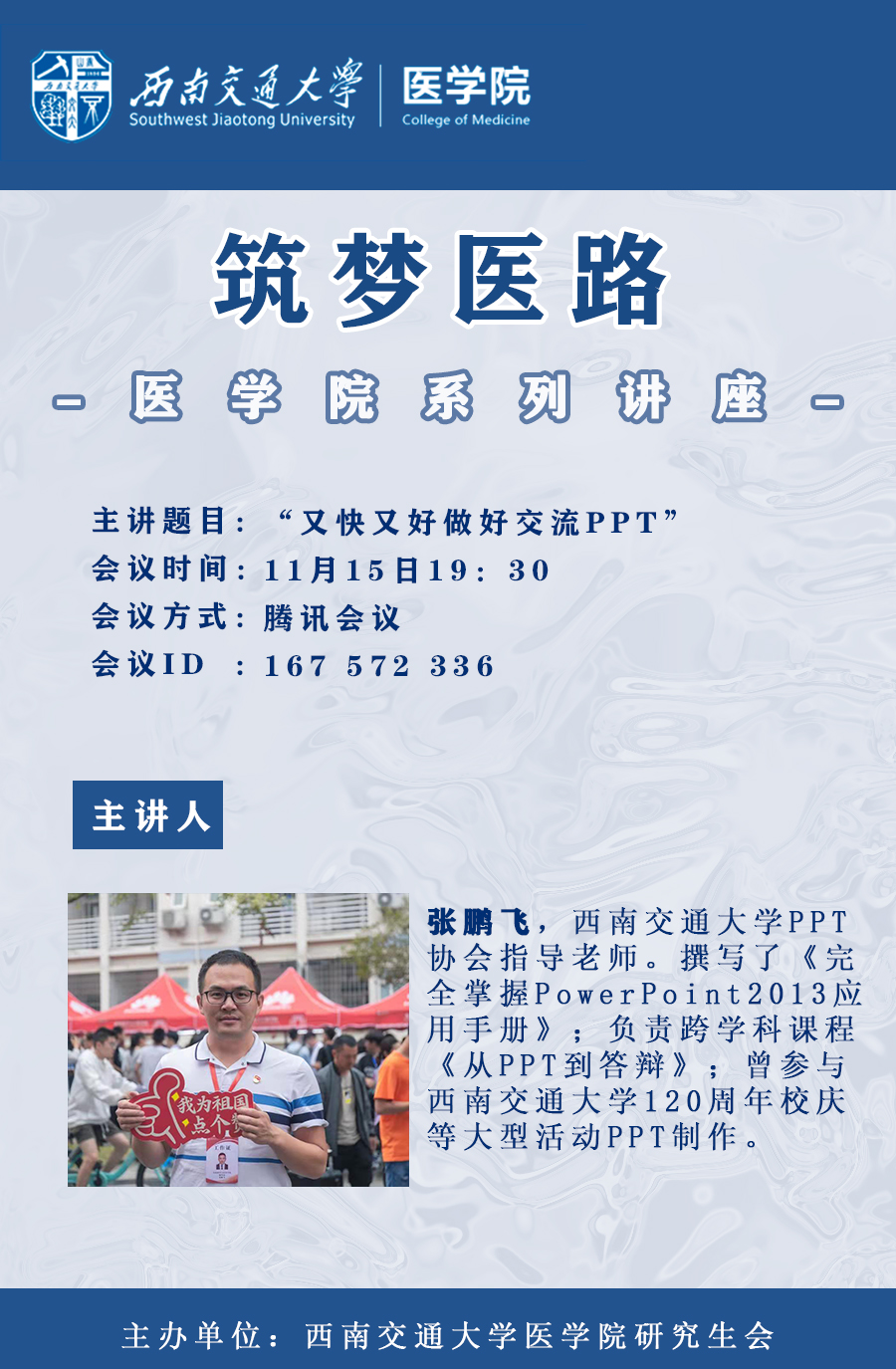 主讲人简介:张鹏飞,西南交通大学PPT协会指导老师。撰写了《完全掌握PowerPoint2013应用手册》;负责跨学科课程《从PPT到答辩》;曾参与西南交通大学120周年校庆等大型活动PPT制作。