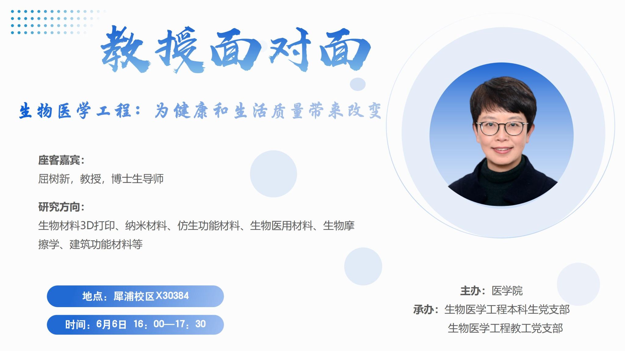 为助力本科生成长成才、进一步拉近师生距离、促进师生交流,生医教工党支部、生医本科生党支部,大手拉小手,联合打造“教授面对面”活动。围绕生医学科发展前沿、升学就业等热点问题,开展师生交流。