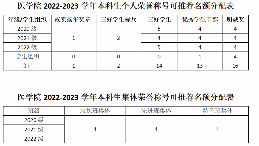 根据学校下发给学院的名额,综合考虑各年级人数规模,现将学院个人荣誉称号、集体荣誉称号名额予以分配,详见附件2