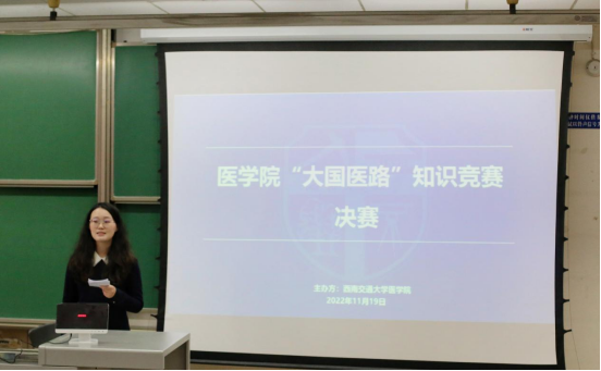 2022年11月19日下午,第一届“大国医路”知识竞答比赛决赛于J4522教室举行。yl23455永利官网党委李锦红书记,专职组织员蔡俊俊,辅导员黄雪梅出席了活动,活动由yl23455永利官网研究生会卫无恙同学主持。