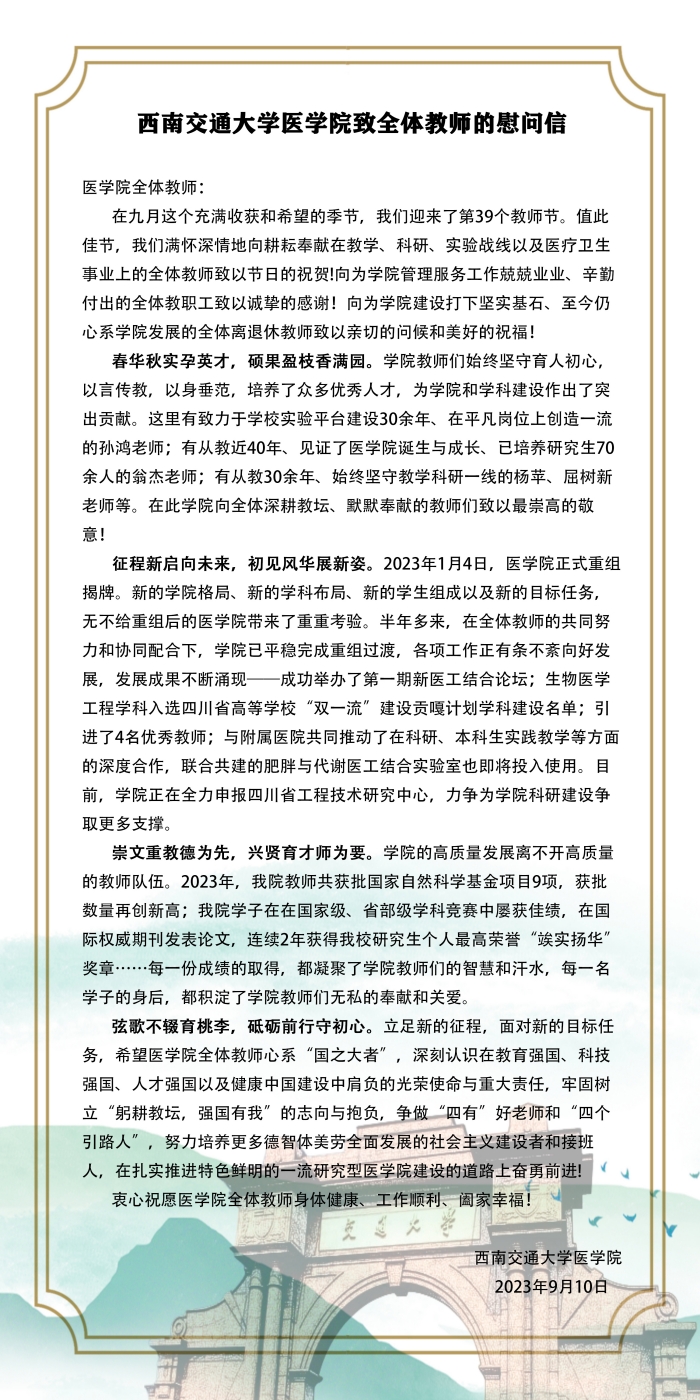 上一条:我院博士生导师裴海峰和博士研究生龚美婷在VB-Link未来医疗专科创新解决方案挑战赛中荣获“最佳创新探索奖” 下一条:【医路生花迎新季】真情系新生,关怀送温暖——学院领导老师慰问2023级军训本科生