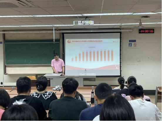 李锦红书记从一张中国的人均预期寿命发展趋势图引入,讲述了我国自新中国成立以来在卫生健康事业方面的发展变化。从新中国成立初期的传染病横行、人均寿命仅35岁,到现在建立起了世界上规模最大的基本医疗保障网在全球的新冠疫情防控战中也展现出了非凡的大国实力,建立“健康中国”,党和国家在这百年间在卫生健康领域取得了显著的成就,中华民族实现了从“东亚病夫”到“东方巨人”的伟大转变。