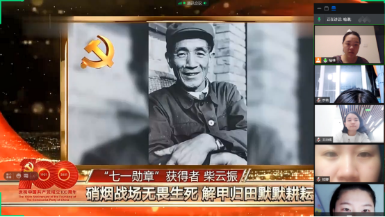 临床第二党支部的张雪同志讲到:心中有信仰,脚下有力量。七一勋章镌刻着共产党人的精神坐标。每一位获得者都是我们民族的伟大英雄。周永开先生用自己的一言一行生动地诠释了共产党员对信仰的坚守。他忠诚坚定、锤炼党性,生命不止、奉献不息,值得我们每一位共产党员学习的光辉典范。作为新时代的青年,我们应以此为范,不忘初心,牢记使命。回首百年,我无法想象战争的残暴,也不敢去想象,但是我却能够深切地感受到柴云振老先生那种勇敢无畏的精神、那种保家卫国的精神和那种强烈的爱国之情。他们的事迹可学可做,他们的精神可追可及。作为新时代的年轻党员,要以受表彰的先进共产党员们为榜样,充分发扬艰苦奋斗的时代精神,以最高标准要求自己,不断追求进步,做到无愧于时代、无愧于祖国。
