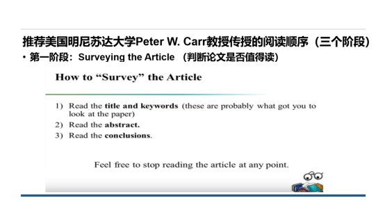 紧接着,由张雪同志进行分享。她强调了阅读文献是科学研究的重要组成部分,应贯穿科学研究的始终。为了让大家更直观的了解“如何高效阅读文献”,张雪同志从文献的阅读顺序出发,介绍了美国明尼苏达大学Peter W. Carr教授传授的阅读顺序三个阶段,并以一篇文献为例,通过剖析文章结构,代入前面介绍的阅读顺序,告诉新生们每一部分应该怎么阅读,并提醒各位文献阅读的注意事项,让每一位听众都能够更加直观地了解如何提高文献阅读效率。