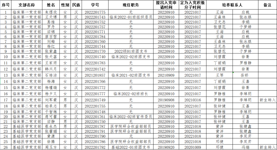 经学生本人递交入党申请书、党组织考察谈话、团支部推优或党员推荐、党支部委员会研究决定,现将yl23455永利官网党委2022年第二批入党积极分子名单公示如下,公示期10月19日-10月24日,如有异议请以书面形式将意见反馈至yl23455永利官网A209办公室。