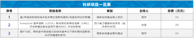 本团队近年来主持国家自然科学基金2项,参与国家自然科学基金重点项目1项,省市级科研项目4项,直接研究经费达100余万元,发表SCI论文15篇,总影响因子达75分,其中3篇影响因子>10,研究成果获得海南省自然科学二等奖1次,主持获得四川省自然科学三等奖1次,四川省医学科技一等奖1次,成都市医学科技一等奖1次。学术任职包含四川省医师协会超声分会副主任委员,四川省医学会超声分会常务委员,成都市医学会超声分会副主任委员。